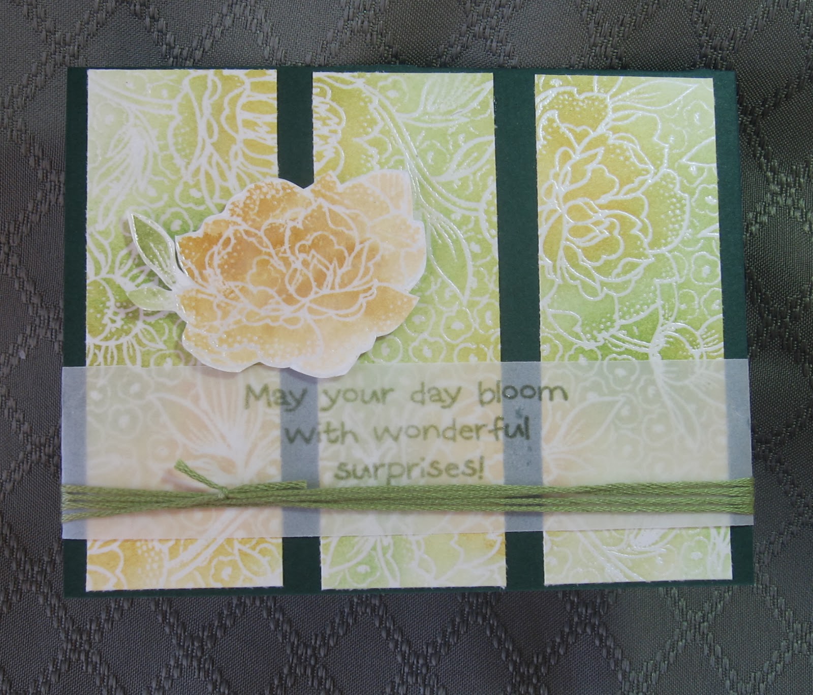 In my dsp collection, I found just the right color purple and green pieces to use (as shown) to highlight the flowers without overpowering them. I colored the stems with a Mellow Moss marker and mounted the panel to a mellow moss scrap of textured cs, which I also used for the greeting. For the final touch, I brought out the gems and embroidery floss, attaching all as shown.